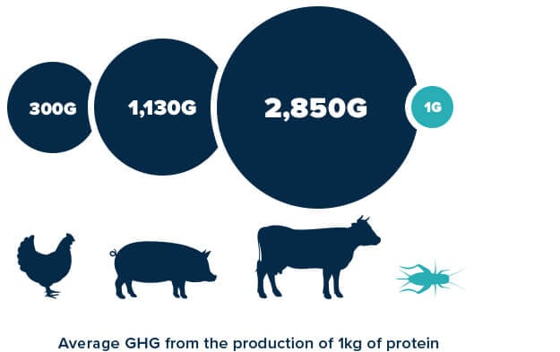 コオロギ(昆虫食)は鳥、豚、牛などの家畜に比べてタンパク質1kgあたりの温室効果ガスの排出量が「数百〜数千分の1」と低く環境に優しい食べ物です。